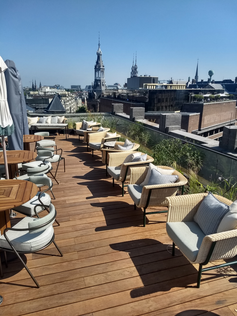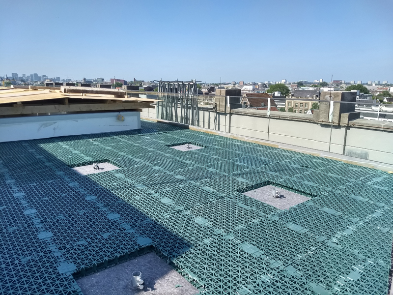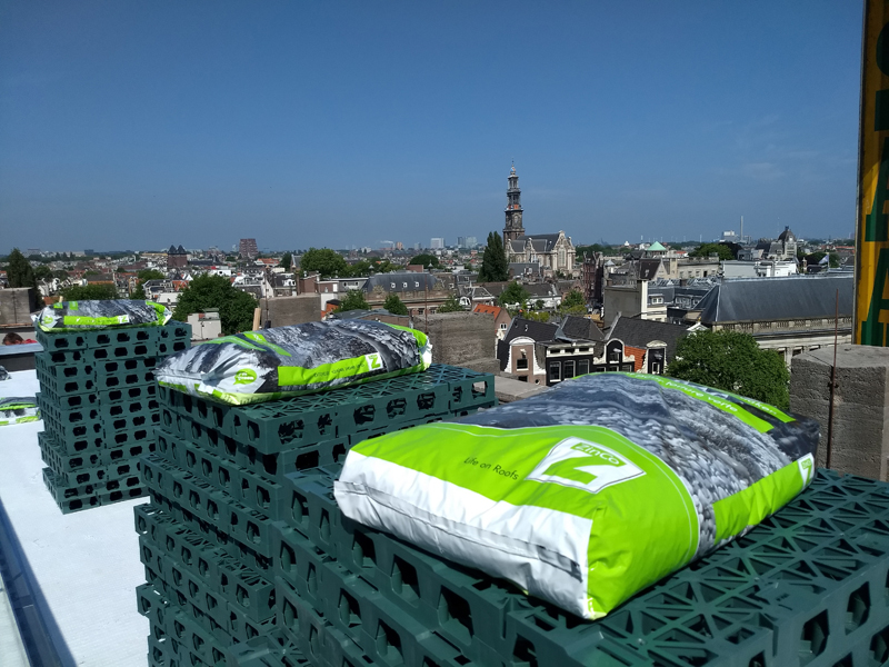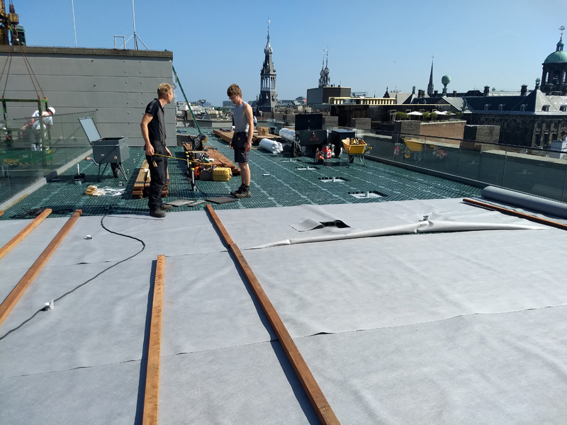 Dieser spezielle Dachgarten mit seinen verschiedenen Gestaltungselementen wurde in dem engen Zeitfenster von nur sechs Wochen realisiert. Das erforderte eine erfolgreiche und effiziente Zusammenarbeit zwischen Bauunternehmer, Dachdecker, Dachbegrüner, Installateur und Schwimmbadbauer, die alle gleichzeitig auf dem Dach sein mussten. Erschwert wurde dies durch den besonderen Standort des Gebäudes an der Spuistraat: beengte Platzverhältnisse ohne die Möglichkeit einer Lagerfläche, Genehmigungen für notwendige Straßensperrungen und die Aufbringung sämtlicher Materialien auf das Dach mit einem Turmkran. Dort wurde dann alles in Handarbeit geleistet. Dank ausgeklügelter Logistik und Baustellenplanung konnten diese Herausforderungen gemeistert werden. J