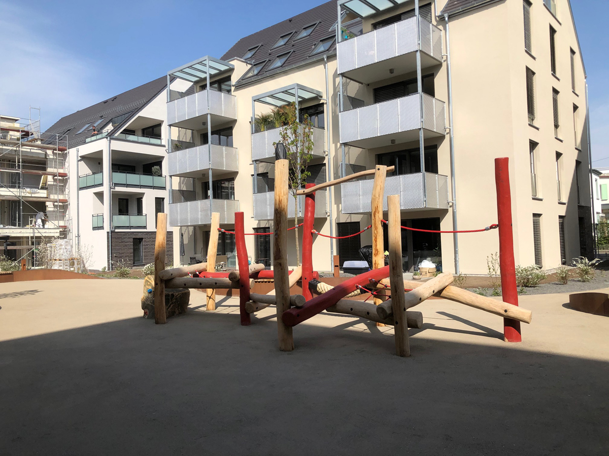 Verschiedenste Ausstattungselemente, wie die geschwungenen Cortenstahl-Elemente, sind auf dem Dach punktuell einbetoniert, und zwar oberhalb der druckfesten Dränageschicht »Floradrain FD 60 neo«, welche die durchgängige Dränage sichert. Diese vorgefertigten Elemente integrieren teilweise auch mit Holz beplankte Sitzbänke. Die Bodenplatten der Klettergerüste sind zur Verankerung ebenfalls in Betonfundamente gesetzt, in diesem Fall direkt auf der Tiefgaragendecke.