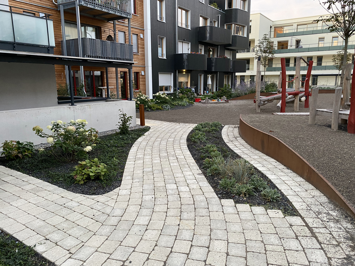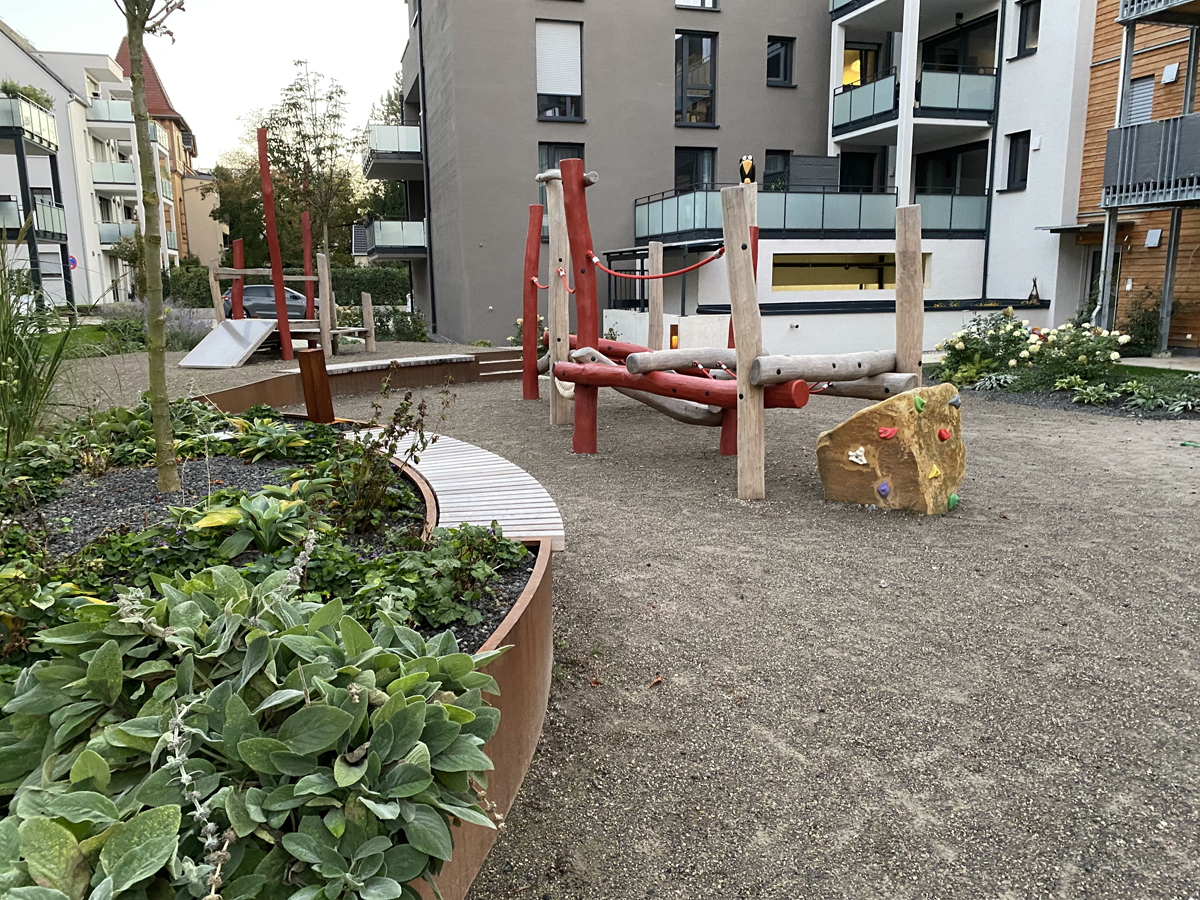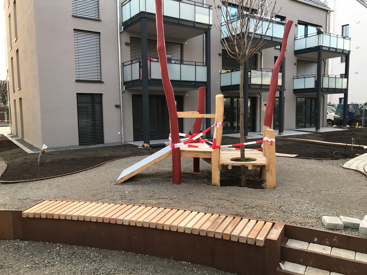 Interessant an der gesamten Grünflächenplanung sind die geschwungene Linienführung und unterschiedliche Höhenniveaus über das Gelände. Die jeweiligen Bereiche sind mit Cortenstahl voneinander abgegrenzt und laufen fließend aus.